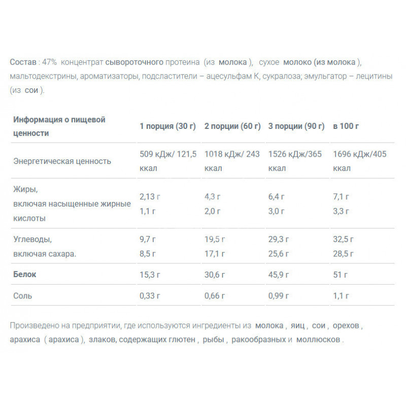 Концентрат сывороточного протеина — 47% (из молока), сухое молоко (из молока), мальтодекстрин, ароматизаторы, подсластители (ацесульфам К, сукралоза), эмульгатор — лецитины (из сои).